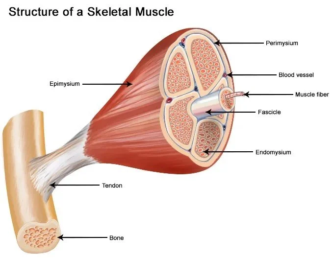 First , let me quickly explain what happens when you “strain” or “tweak” a muscle, and why it causes pain. Looking at the image below, you can see that the main part of a muscle is attached to the bone by a tendon. You can also see that muscle bellies are made up of “bundles” of little muscle fibers. These muscle fibers contract and relax the muscle.